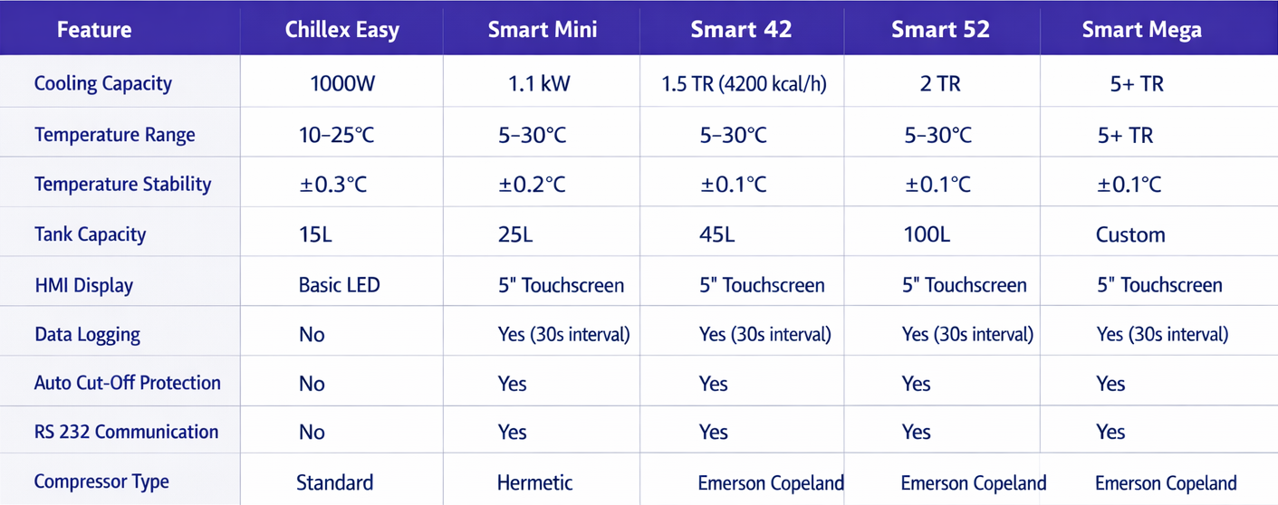 From 500W compact laboratory units to 5+ TR industrial systems—all engineered for 24/7 continuous duty cycle.